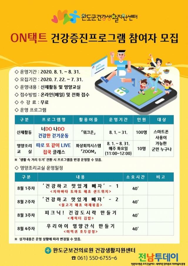 [전남투데이 김오례기자]완도군 건강생활지원센터에서는 코로나19로 인해 외부 활동이 제약이 생기면서 부족해진 신체 활동 및 증가하는 비만율을 개선하고자 8월부터 ‘온(on)택트 건강증진 프로그램’을 운영한다고 밝혔다.