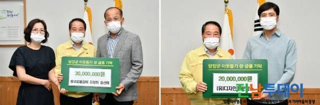 13일 담양군에 따르면 지난 7일부터 최고 600㎜가 넘는 폭우가 내리면서 침수피해가 속출한 가운데 쌍교숯불갈비 김창회,송선희 부부가 피해 주민들을 위해 성금 3,000만 원을 기탁했으며, (유)디자인 프로방스(전무 이철용)에서 2,000만 원, ㈜우리종합기술(대표 윤지현)에서 500만 원을 기탁했다.