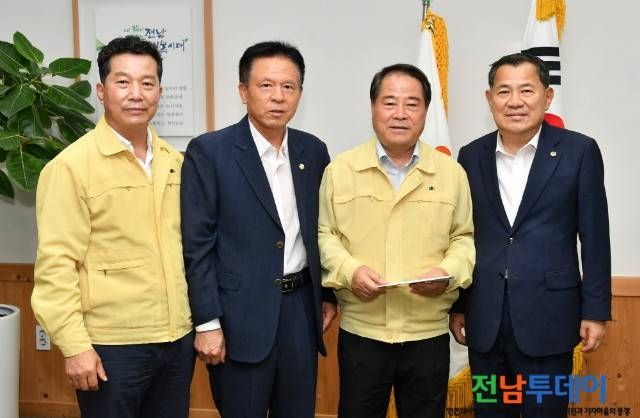 목포시의회 박창수 부회장과 영광군의회 최은영 의장은 12일 담양군을 방문하여 협의회장인 김정오 회장과 함께 수해현장에서 연일 복구 작업에 매진하고 있는 최형식 군수를 비롯한 관계자들을 격려하고 성금을 전달했다.