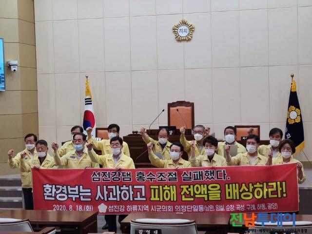 오랜 기간 섬진강과 공존하며 삶의 터전을 가꿔온 섬진강 지역민들은 1961년 정해놓은 홍수조절 계획을 이용해 관리해온 수자원공사와 환경부에 이번 재난으로 많은 이재민과 재산손실을 발생시킨 책임을 묻고자 구례군의회 의장단(의장 유시문, 부의장 박정임)등 섬진강지역 7개 시․군 의장단이 공동 성명서를 통해 강한 입장 표명을 하였다.