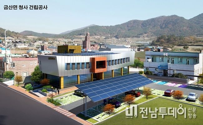신축중인 금산면사무소는 면민들의 삶을 닮은 배를 형상화하는 미래지향적이고 역동적인 건물 형태로 대지면적 3,536㎡, 연면적 1,262㎡(지상2층)로 1층은 사무실·민원실·북카페·주민소통실, 2층은 대회의실·소회의실·면장실·문서고·창고 등으로 조성되고 있다.