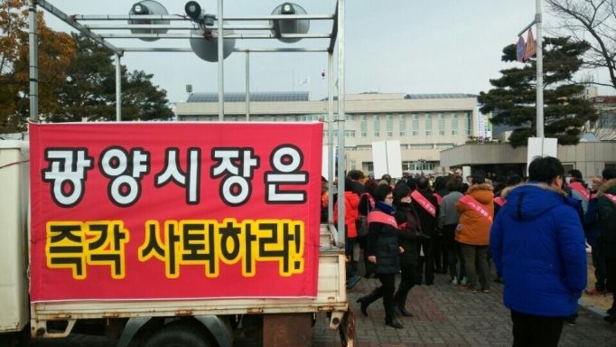 광양시 상인협회와 광양시민 천 여명이 광양시청앞 광장에모여.골목상권과, 전통시장, 중소 소상공인을 죽이고 지역경제 말살의 주범이될 아울렛 입점을 반대 한다, 는 프래카드를 내걸고 시장과 도지사에게도 책임이 있다면서 아울렛 입점 반대시위를 벌이고 있다.