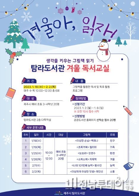 전남투데이 김영범 기자 | 제주시 탐라도서관은 겨울방학을 맞이해 어린이들에게 독서의 즐거움을 일깨우기 위한 ‘2023년 겨울독서교실’을 운영한다.