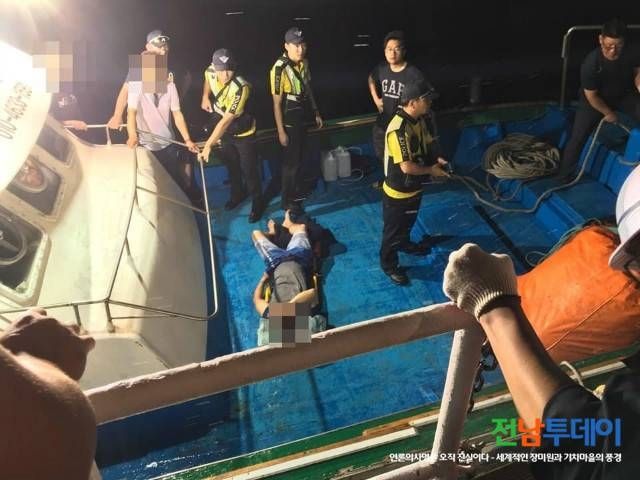 또한, 민간해양구조선 삼도호(9.77톤, 연안복합) 선장 공효신(50세, 남) 씨에게 구조요청을 하여 환자ㆍ보호자 각 1명을 민간해양구조선과 500톤ㆍ100톤급 경비함정이 신속하게 릴레이 이송하여 오늘 오전 12시 7분께 고흥군 봉래면 축정항에 대기 중인 119구급대원에게 응급환자를 인계 여수 소재 병원으로 이송조치 하였다.
