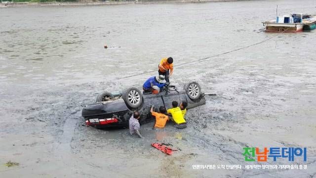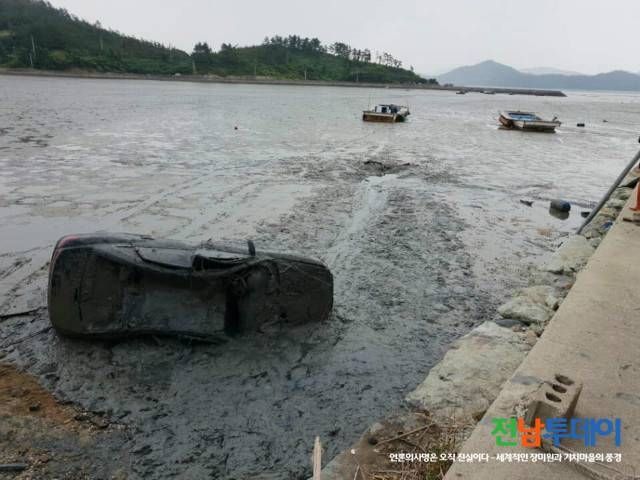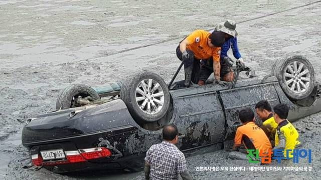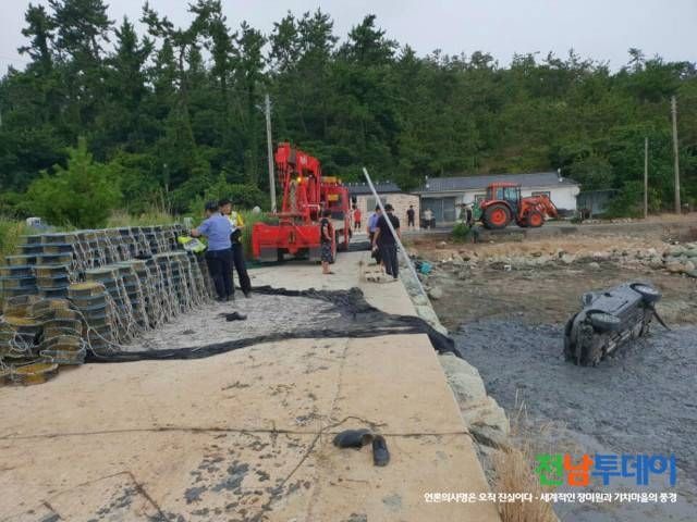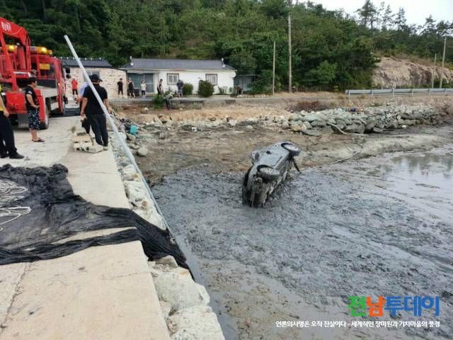 [전남투데이 윤진성 기자]완도해양경찰서(서장 김영암)는 2018 7일 낮 12시 57분께 전남 해남군 황산면 한 어촌 선착장에서 그랜저 승용차가 방파제 아래 갯벌로 추락해 뒤집혔다.