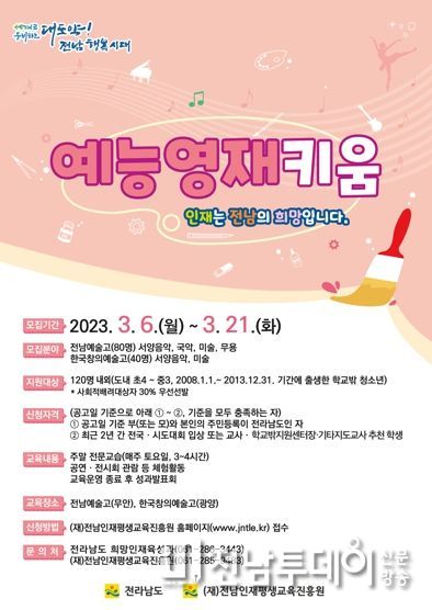 전남투데이 김완규 기자 | 전라남도는 음악, 미술, 무용 등 예술에 재능 있는 영재의 재능 계발을 지원할 ‘예능영재 키움’ 참여 청소년을 오는 21일까지 모집한다고 밝혔다.
