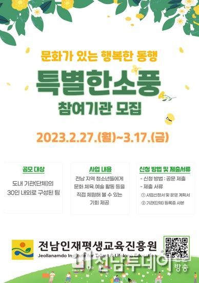 전남투데이 김완규 기자 | 전남인재평생교육진흥원은 지역 청소년에게 다채로운 체험활동을 지원하고 문화 욕구 충족 기회를 제공하는 ‘특별한 소풍’ 참여 기관을 모집한다고 밝혔다.