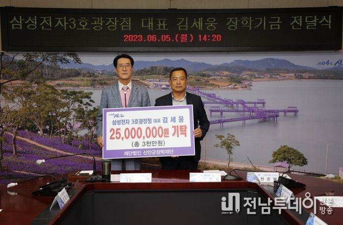 2009년 설립하여 올해로 15년 차인 삼성전자 3호광장점은 목포시 용당동에 위치하여 가전제품 및 부품 도매업을 하고 있으며, 2009년 장학금 3백만 원과 2019년에 2백만 원을 기탁 했고, 이번에도 신안군 지역인재육성에 힘을 보태 총 3천만 원을 기탁했다.