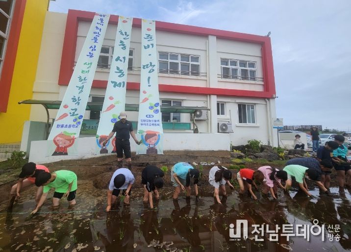 전남투데이 김영범 기자 | 제주도교육청 한동초등학교에서는 6월 7일 교육공동체가 모여 텃논 시농제를 열었다.