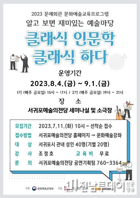 전남투데이 김영범 기자 | 서귀포시는 한국문화예술회관연합회 지원사업으로 선정된 문화예술교육프로그램 '알고 보면 재미있는 예술마당 – 클래식하다' 교육생을 서귀포시민 대상으로 선착순으로 모집한다.