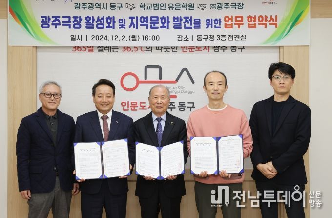 전남투데이 안철우 기자 | 광주 동구는 지난 2일 학교법인 유은학원, ㈜광주극장과 ‘광주극장 활성화 및 지역문화 발전’을 위한 업무협약을 체결했다고 밝혔다.