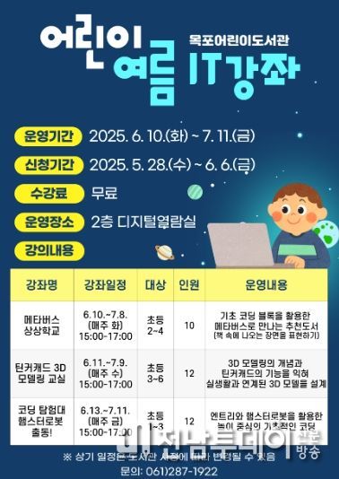 전남투데이 손영욱 기자 | 목포어린이도서관은 어린이들의 문제 해결력과 창의력 향상을 위해 오는 6월 10일부터 ‘2025년 여름 IT강좌’를 실시한다.