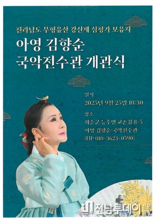 전남투데이 강영선 기자 | 화순군은 오는 9월 25일 전라남도 지정 무형유산(강산제 심청가)보유자 아영 김향순 국악전수관 개관식을 개최한다고 밝혔다.