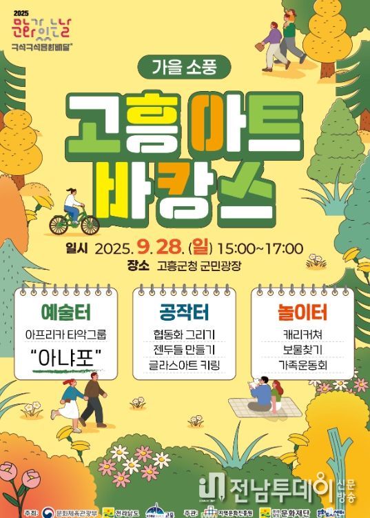전남투데이 조평훈 기자 | 고흥군과 고흥군 문화도시센터는 ‘9월 문화가 있는 날’ 주간을 맞아 ‘구석구석 문화배달 – 고흥아트바캉스’행사를 오는 9월 28일 오후 3시부터 고흥군청 앞 광장에서 개최한다고 밝혔다.