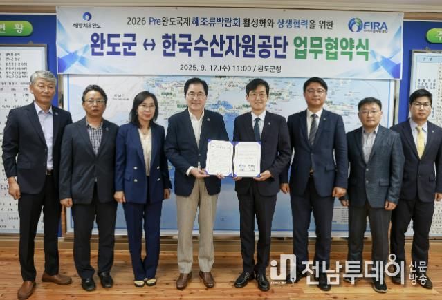 전남투데이 김용희 기자 | 완도군은 한국수산자원공단과 26 Pre완도국제해조류박람회의 성공 개최와 2050 탄소중립 국가정책 실현을 위한 업무 협약을 체결했다.