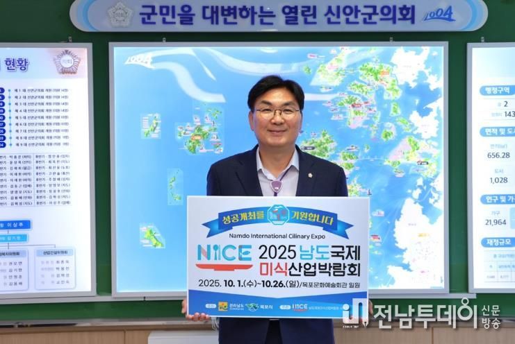 전남투데이 김길룡 기자 | 신안군의회 이상주 의장이 2025년 10월 1일부터 26일까지 목포문화예술회관 일원에서 열리는 ‘2025 남도국제미식산업박람회’의 성공적인 개최를 기원하는 릴레이 응원 캠페인에 동참했다.