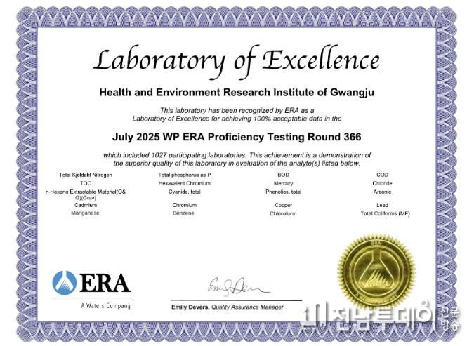 전남투데이 정홍균 기자 | 광주광역시 보건환경연구원이 최근 미국 환경자원협회(ERA)가 주관한 수질분야 국제 숙련도시험에서 전 항목 ‘만족(Satisfactory)’ 판정을 받아 ‘2025 최우수 분석기관(Laboratory of Excellence)’으로 선정됐다.