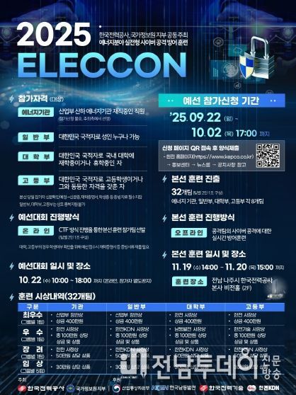전남투데이 손영욱 기자 | 한국전력(대표이사 사장 김동철)이 사이버보안 전문인력 양성과 에너지분야 협력체계를 강화하기 위하여 국정원 지부와 공동으로 ‘2025년 실전형 사이버공격 방어훈련’(ELECCON 2025)을 개최한다.