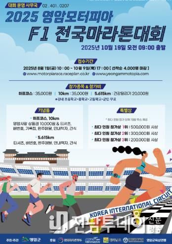 전남투데이 박상훈 기자 | 영암군이 10/9일까지 ‘영암모터피아 F1 전국 마라톤대회’ 참가자 4,000명을 선착순으로 접수받는다.