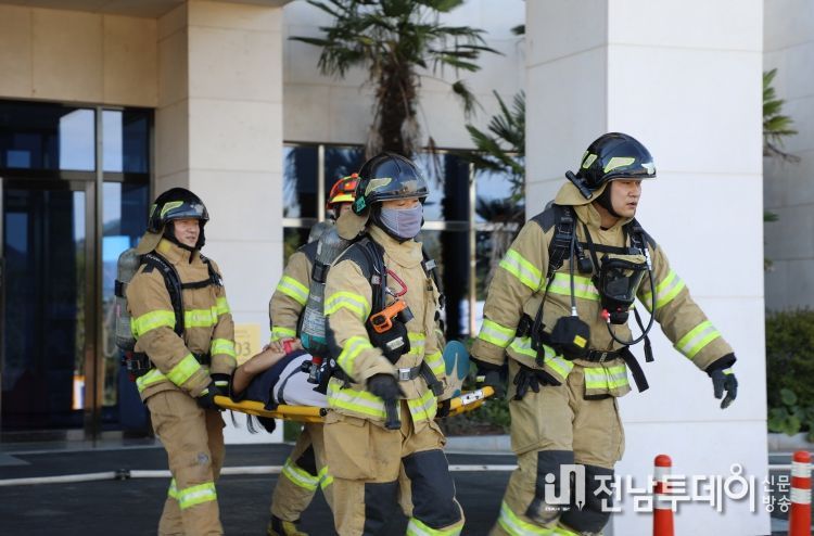 훈련은 강진군 다산베아채 리조트에서 소방본부 등 10개 유관기관ㆍ단체 228여명이 참여한 가운데 에어컨 누전으로 인한 대형화재 및 다수사상자 발생 상황을 가정해 진행됐다.