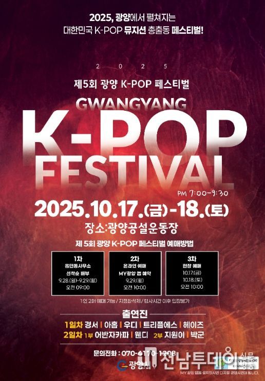 이현주 관광과장은 “오는 28일 티켓오픈을 시작으로 제5회 광양 K-POP 페스티벌에 대한 관심이 한층 뜨거워질 것으로 예상한다”며 “입장권 배부 일정과 달라진 예약 방식을 미리 숙지하면 원하는 좌석을 확보하는 데 도움이 될 것”이라고 말했다.