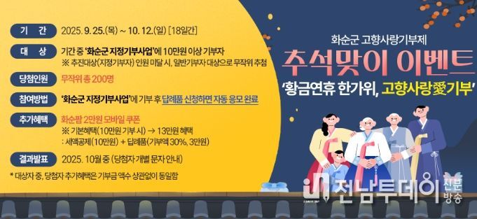 전남투데이 강영선 기자 | 화순군은 민족 대명절 추석을 맞아 고향사랑기부제 감사 이벤트인 ‘황금연휴 한가위, 고향사랑愛기부’를 오는 9월 25일부터 10월 12일까지(18일간) 진행한다고 밝혔다.