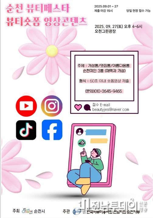 전남투데이 조평훈 기자 | 순천시는 오는 27일 오천그린광장에서 ‘2025 순천뷰티페스타(숏폼경진대회)’를 개최한다고 밝혔다.