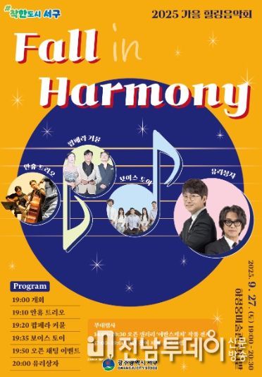전남투데이 정홍균 기자 | 광주광역시 서구는 오는 27일 오후 7시 농성동 하정웅미술관 앞 잔디광장에서 ‘2025 가을 힐링음악회 – 폴 인 하모니(Fall in Harmony)’를 개최한다.