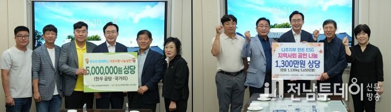 전남투데이 김윤걸 기자 | 전라남도 나주시는 (사)전국한우협회 나주시지부와 (사)대한한돈협회 나주지부가 지난 24일 500만 원 상당의 한우 국거리·곰탕 110박스와 1300만 원 상당의 한돈 565박스(1130kg)을 어려운 이웃을 위해 각각 기탁했다고 밝혔다.