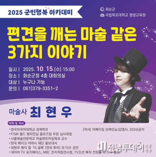 전남투데이 강영선 기자 | 화순군은 오는 10월 15일 수요일 오후 3시, 화순군청 4층 대회의실에서 '2025 군민행복 아카데미 8회차 강연을 개최한다고 밝혔다.
