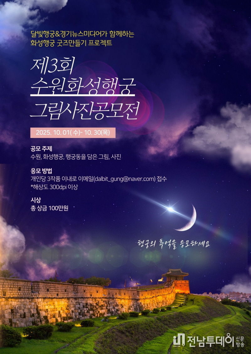 전남투데이 조은별 기자 | 조선 정조의 얼이 깃든 수원화성 행궁의 아름다움이 시민들의 손끝과 눈길을 통해 다시 태어난다. 로컬과 한국 문화를 기반으로 굿즈를 제작해온 달빛행궁이 경기뉴스미디어와 함께 ‘제3회 수원화성 그림·사진 공모전’을 연다.