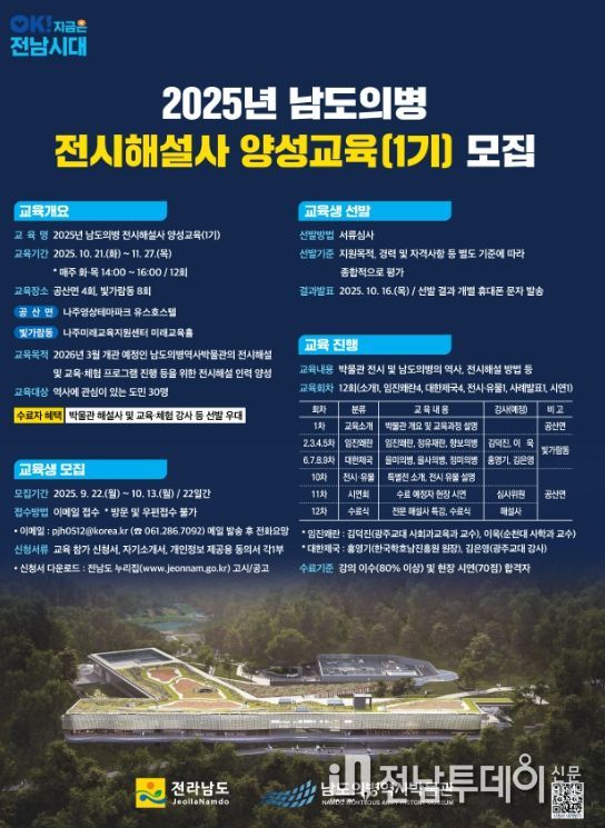전남투데이 손영욱 기자 | 전라남도는 2026년 3월 개관 예정인 남도의병역사박물관에서 활동할 전시해설사와 교육·체험 강사 양성을 위해 오는 10월 13일까지 교육생 30명을 모집한다고 밝혔다.