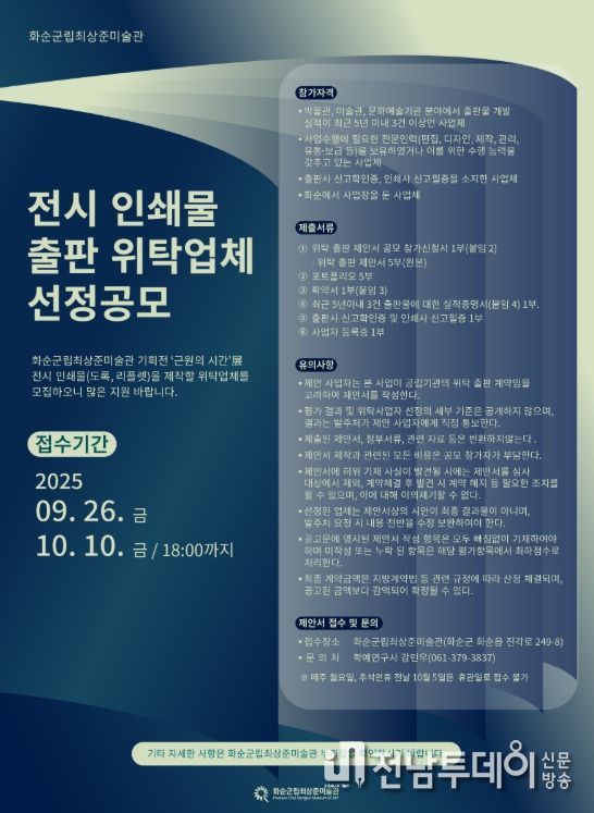 전남투데이 강영선 기자 | 화순군은 29일 화순군립최상준미술관 기획전 ‘근원의 시간’ 展의 전시 인쇄물(도록, 리플렛) 제작을 전문적으로 수행할 위탁업체를 공개 모집한다고 밝혔다.