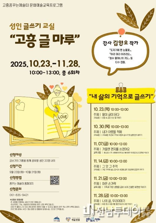전남투데이 조평훈 기자 | 고흥군과 고흥군문화도시센터는 오는 10월부터 11월까지 '성인 글쓰기 교실: 고흥 글마루'를 운영한다고 밝혔다.