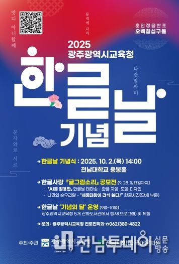 시교육청은 오는 10월 2일 전남대 용봉홀에서 전남대학교와 공동으로 ‘579돌 한글날 기념식’을 개최한다. 이날 기념식은 이정선 교육감과 이근배 전남대 총장 등이 참석한 가운데 훈민정음 해례본 낭독, 한글 발전 유공장 포상, 축하공연 순으로 열린다.