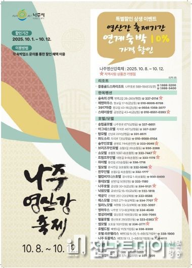 전남투데이 김윤걸 기자 | 전라남도 나주시가 오는 10월 8일부터 12일까지 열리는 ‘2025 나주영산강축제’ 기간 동안 지역 숙박업소와 함께하는 숙박 특별할인 상생 이벤트를 마련했다.