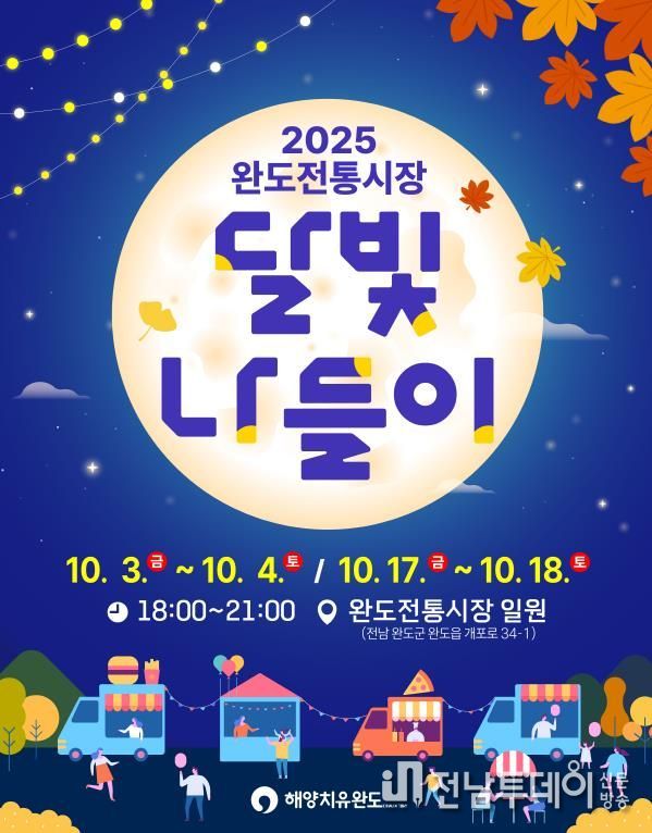 전남투데이 김용희 기자 | 완도군은 10월 첫째, 셋째 주 금·토요일 오후 6시부터 9시까지 총 4회에 걸쳐 완도전통시장에서 ‘달빛 나들이’ 행사를 개최한다.