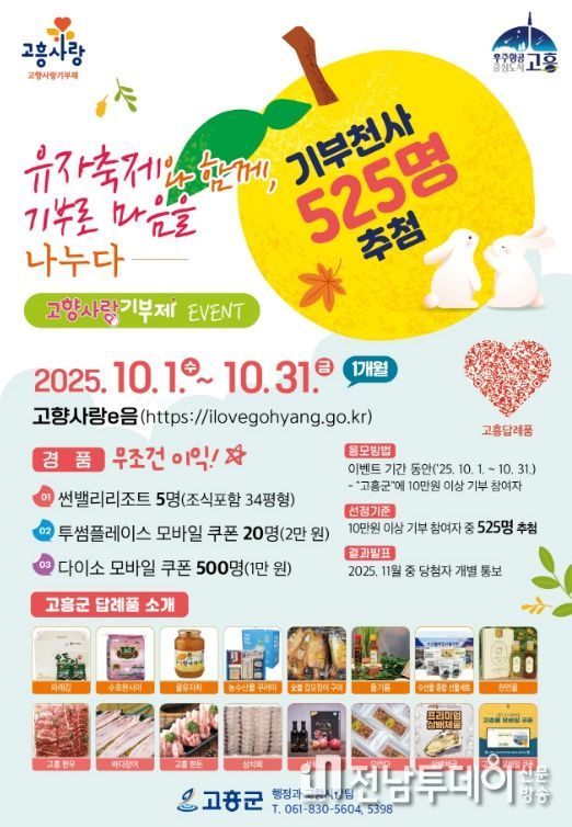 이벤트 기간(10.1~10.31) 중 고흥군에 10만 원 이상 기부한 참여자는 자동 응모되며, 추첨을 통해 총 525명에게 푸짐한 선물이 제공된다. 경품은 ▲고흥 썬밸리 숙박권(조식 포함, 36평형) 5명 ▲투썸플레이스 모바일 음료 쿠폰(2만 원권) 20명 ▲다이소 모바일 상품권(1만 원권) 500명이다.