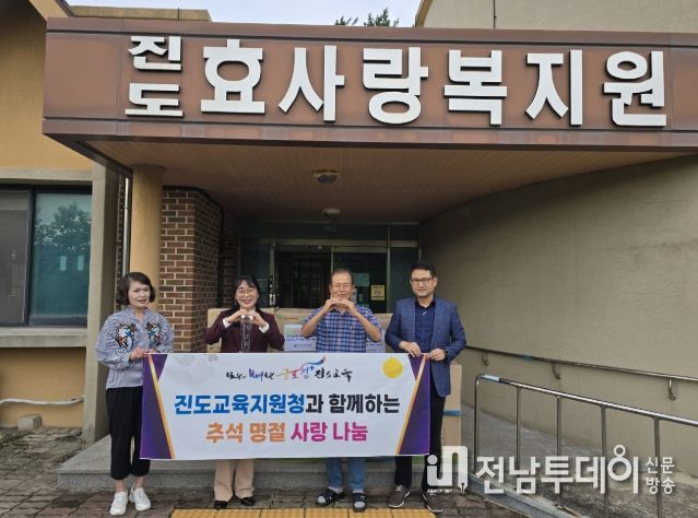 전남투데이 문경식 기자 | 진도교육지원청은 9월 29일 다가오는 추석 명절을 맞아 지역 내 사회복지시설 2곳(효사랑복지원, 카리타스노인복지센터)을 방문해 정성을 담아 준비한 위문품을 전달하며 따뜻한 이웃사랑을 실천했다.