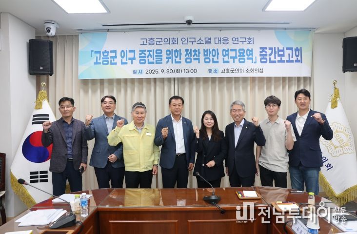 전남투데이 조평훈 기자 | 고흥군의회 의원연구단체인 ‘고흥군의회 인구소멸 대응 연구회(대표 박경석)’는 지난 9월 30일 군의회 소회의실에서 ‘고흥군 인구 증진을 위한 정착 방안 연구용역’ 중간보고회를 개최했다.