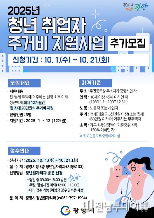 전남투데이 조평훈 기자 | 광양시는 청년들의 주거 안정을 위해 10월 1일부터 21일까지 ‘2025년 청년 취업자 주거비 지원사업’ 추가 모집을 진행한다고 밝혔다.
