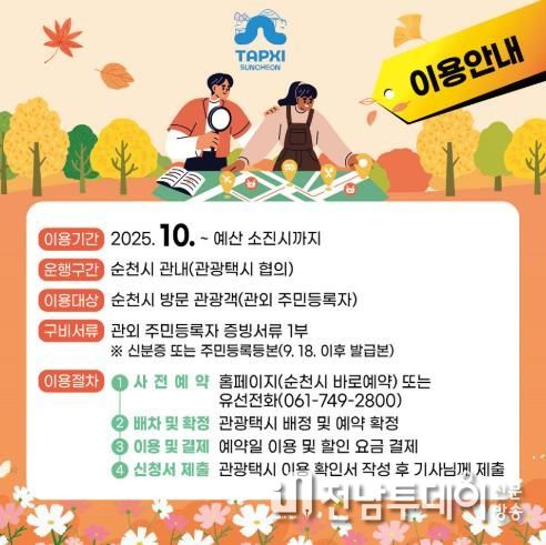 전남투데이 조평훈 기자 | 순천시는 10월부터 순천 관광택시 ‘가을맞이 반값 할인 이벤트’를 진행한다고 밝혔다.