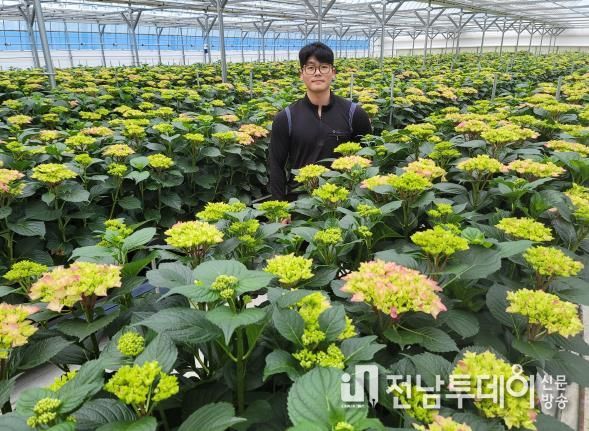 김승찬 대표는 한국농수산대학 화훼학과 출신의 청년 농업인으로, 2023년부터 현대식 스마트팜 하우스를 신축해 수국 재배를 본격화했다.