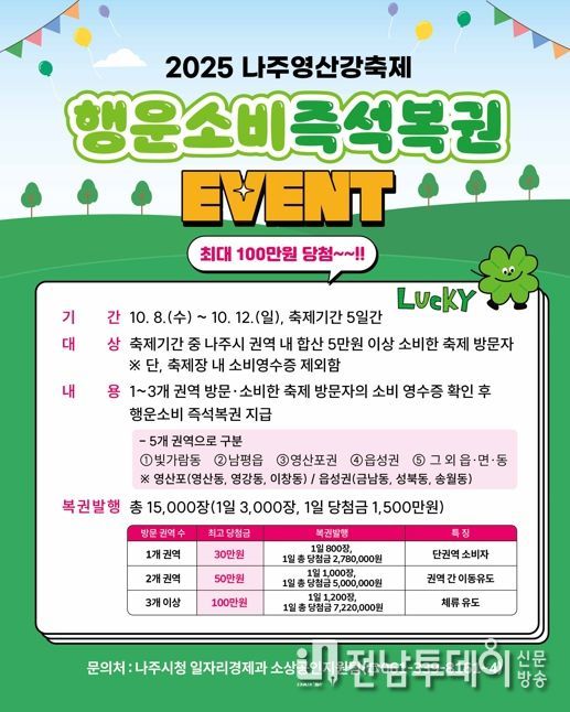 전남투데이 김윤걸 기자 | 전라남도 나주시가 ‘2025 나주영산강축제’를 찾는 시민과 관광객들에게 특별한 즐거움과 함께 지역 상권 활력을 불어넣기 위해 ‘행운 소비 즉석 복권 이벤트’를 진행한다.
