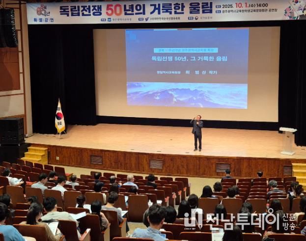 전남투데이 정홍균 기자 | 광주시교육청은 1일 학생교육문화회관 공연장에서 광복 80주년을 맞아 인문학 강연 ‘독립운동 50년의 거룩한 울림’을 진행했다.
