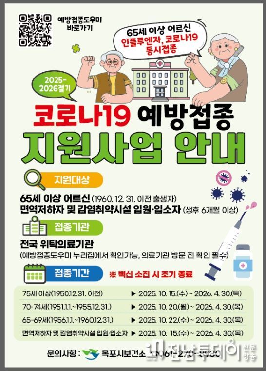 접종 대상은 ▲65세 이상 어르신 ▲생후 6개월 이상 면역저하자 ▲감염취약시설 입원·입소자이며, 목포시 위탁 의료기관 71개소에서 모더나와 화이자 등 LP.8.1 백신을 무료로 접종받을 수 있다.