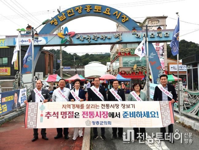 전남투데이 김용희 기자 | 장흥군의회는 10월 2일, 지역 대표 전통시장인 정남진 토요시장에서 ‘추석 맞이 장보기 행사’를 열었다.