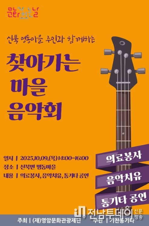 전남투데이 박상훈 기자 | (재)영암문화관광재단은 2025 문화가 있는 날 행사지원 사업으로 생활문화 동호회인 기찬통기타(대표:최문일)와 함께 신북 명동마을 주민을 대상으로 한 ‘찾아가는 마을 음악회’를 오는 10월 9일 한글날에 개최한다고 밝혔다.