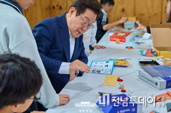 이어 명절을 맞아 딱지, 팽이 등 전통 장난감 만들기 체험을 하고 있던 아이들을 만난 이재명 대통령은 아이들과 일일이 하이파이브를 하며 인사를 나누고, 놀이를 함께했다.