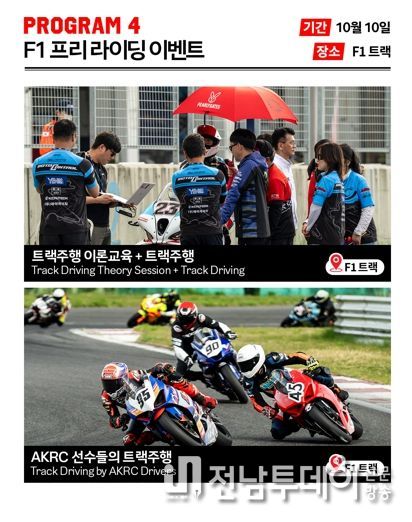 10일에는 일반 바이크 라이더들을 대상으로 전문 선수들의 이론교육이 진행된다. 서킷 주행을 통해 안전한 주행 기술을 습득할 수 있으며, 모터스포츠 저변 확대와 건전한 바이크 문화형성에 긍정적인 영향을 줄 것으로 기대된다.